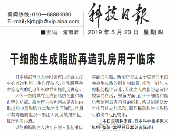 2019-05-24 查看更多日本橫濱市立大學(xué)附屬市民綜合醫(yī)療中心首次利用再生醫(yī)療技術(shù),對(duì)乳腺癌手術(shù)等造成的乳房組織缺損實(shí)施乳房再造。人體干細(xì)胞具有生…