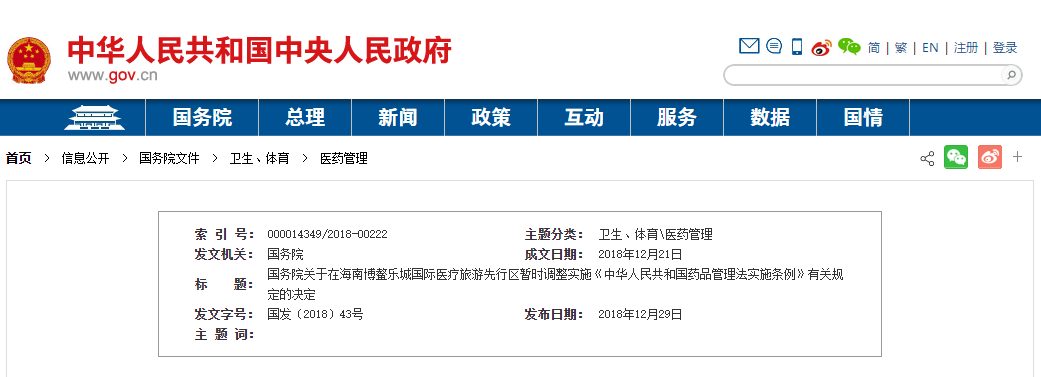 近日,國務院發(fā)布《關于在海南博鰲樂城國際醫(yī)療旅游先行區(qū)暫時調整實施<中華人民共和國藥品管理法實施條例>有關規(guī)定的決定》。國務院決定,在海南博鰲樂城國際醫(yī)療旅游先行區(qū)暫時調整實施《中華人民共和國藥品管理法實施條例》第三十六條的規(guī)定,對先行…