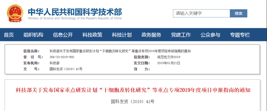 2019年1月21日,我國科技部官網(wǎng)正式發(fā)布了“干細胞及轉化研究”重點專項2019年度項目申報指南,指南中明確:在之前已支持98個項目的基礎上,2019年國家再撥款4億元,支持12個干細胞研究方向。其中干細胞資源庫、干細胞治療性腺衰老也寫入申報指南。指南中明確…